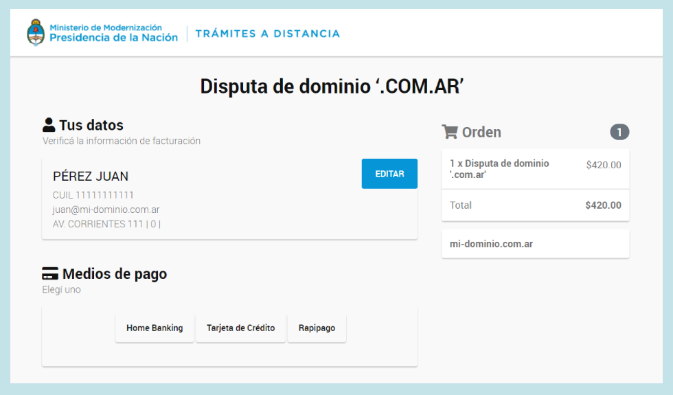 Si vas a disputar a nombre de otra persona humana o de una persona jurídica a la que representás seguí los pasos del instructivo Trámites de dominio en representación de otra persona.